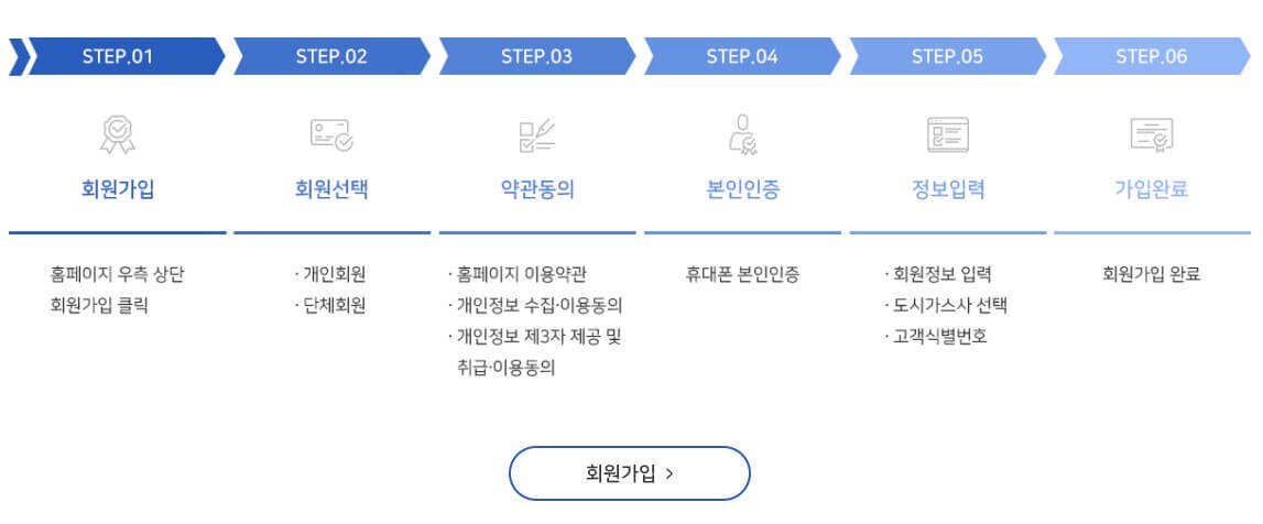 도시가스 캐시백 신청은 회원가입 완료됨과 동시에 캐시백 신청이 완료됩니다. 아래의 회원가입 안내를 참고하세요.