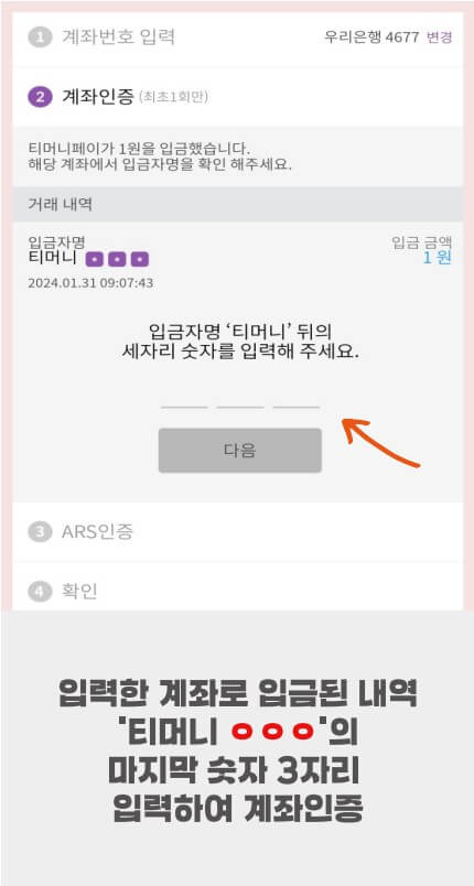 8. 입력한 계좌로 1원이 입금됩니다. 입금 알림 문자에서 '입금자명 티머니 OOO'에 세 자리 숫자 OOO을 입력해 줍니다.