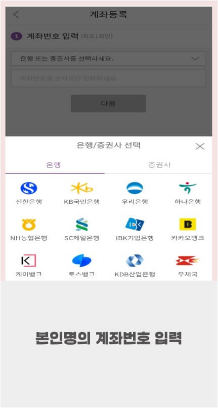 7. 기후동행카드 요금을 결제할 은행/증권사를 선택하고, 계좌정보를 입력합니다.