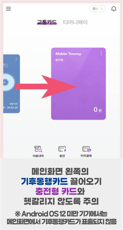 (만약 화면 왼쪽에 기후동행카드가 보이지 않는다면, 휴대전화 운영체제가 안드로이드 OS12 미만일 수 있습니다. 기후동행카드는 휴대전화 운영체제가 안드로이드 OS12 이상이 되어야 사용이 가능합니다. 그럴 경우에는 기후동행카드 실물카드를 구매하기 바랍니다.)