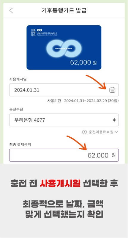 2. '사용개시일'을 설정해줍니다. 한 번 충전하면 사용개시일로부터 30일간 이용이 가능합니다.
