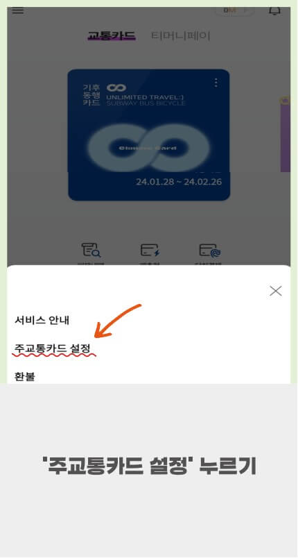 3. 충전이 완료되면, 기후동행카드 오른쪽의 설정버튼을 눌러 '주교통카드 설정'을 해줍니다. 주교통카드로 설정을 하고 편하게 사용하세요.