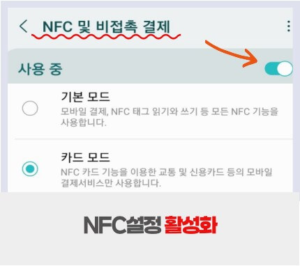 1. 'NFC 및 비접촉 결제'를 '사용 중'으로 설정하고, '카드 모드'를 설정 해 줍니다.