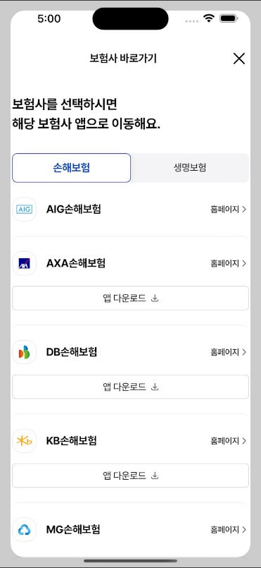 - 별도 등록 없이 한국신용정보원에서 조회된 나의 보험계약을 바로 확인하여 보험금 청구를 할 수 있습니다.