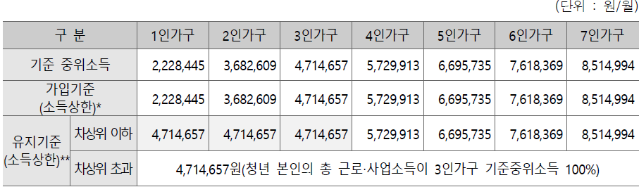 ** 유지기준 : 청년의 총 근로·사업소득이 기준중위소득 100% 이하