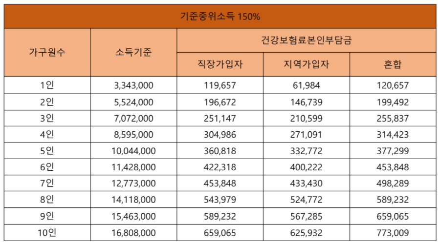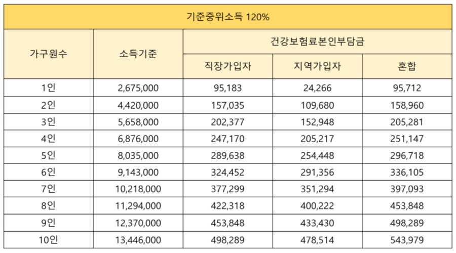 2024년 건강보험료 소득판정 기준 중위 소득 150%와 120%를 정리한 내용입니다.