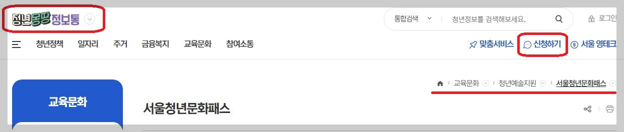 🔹 청년몽땅정보통 접속 후 우측 상단의 '신청하기' 메뉴에서 신청하세요.